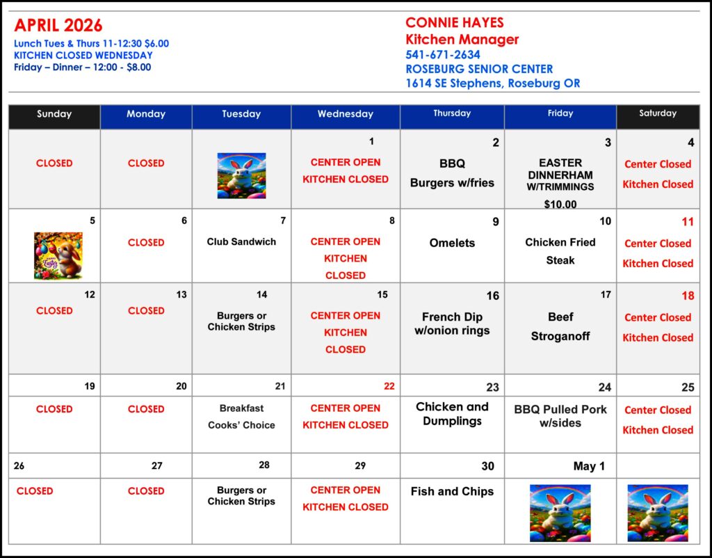 Tues and Thursday lunch $6.00 11:00 – 12:30