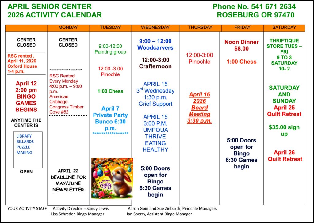 (541) 671-2634 roseburgseniorcenter@gmail.com Facebook Halloween Party, October 31, 2025 Christmas Dinner , December 20, 2024 Graffiti Weekend July 12, 2025 October 19, 2024 We Honor Our Veterans. Nov. 11, 2023 Murder Mystery Play Fall 2023 Hawaiian Luau Summer 2023 10th Annual Holiday Bazaar and Bake Sale, Sat and Sun Dec. 10 & 11 Umpqua Arts Festival June 28-30 Pinochle Marathon, April 16, 2019 Winter Bingo Marathon, January 12, 2019 1614 SE Stephens St. Roseburg. Oregon 97470 P.O. Box 894 541-671-2634